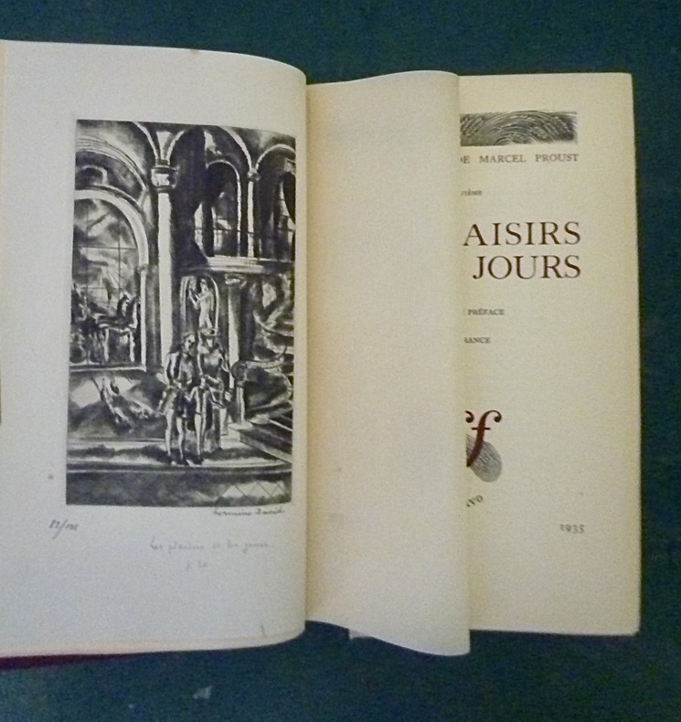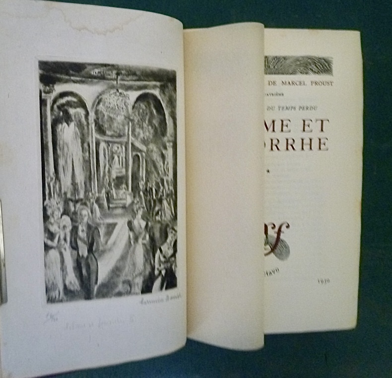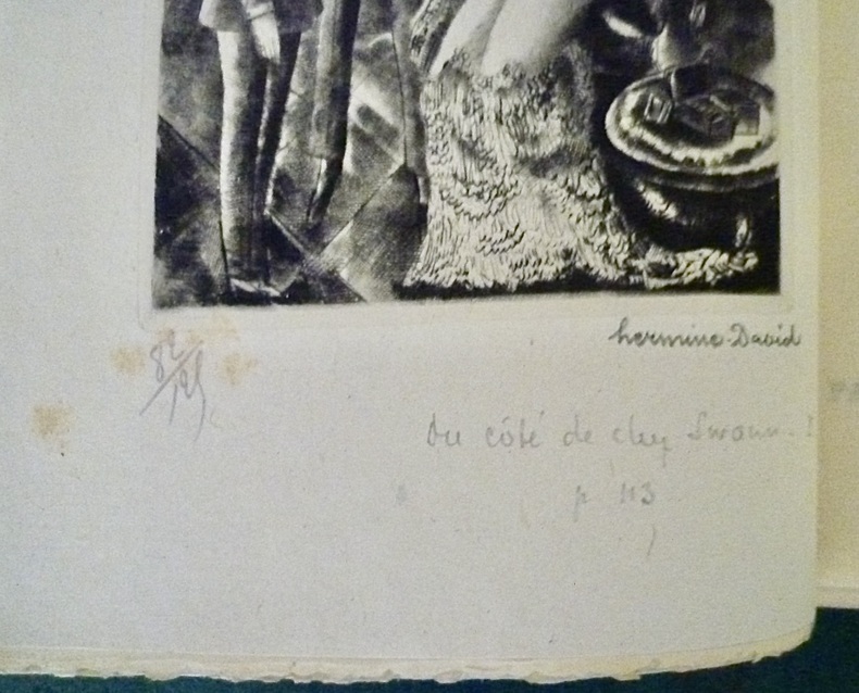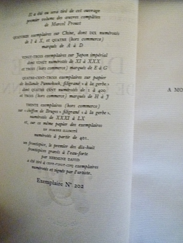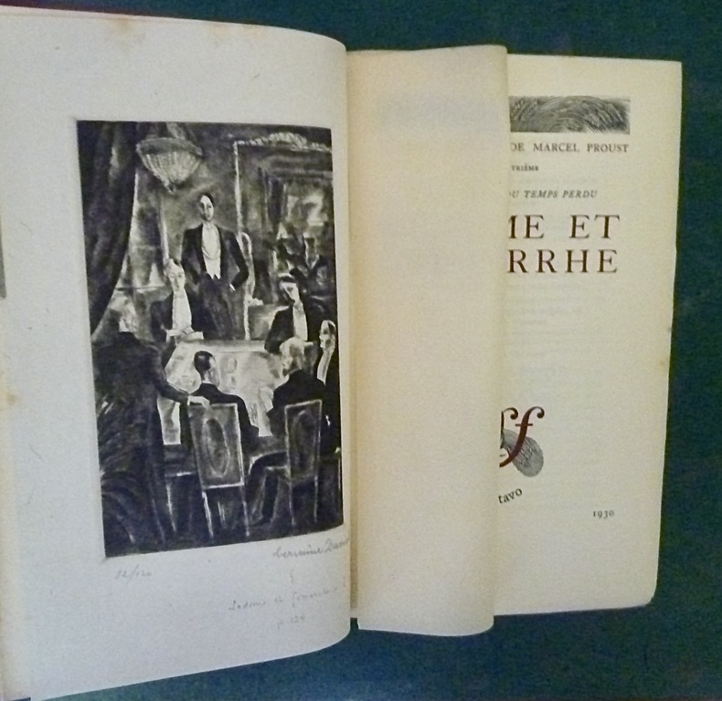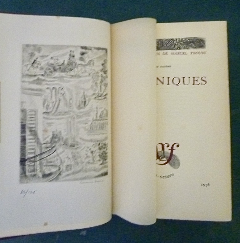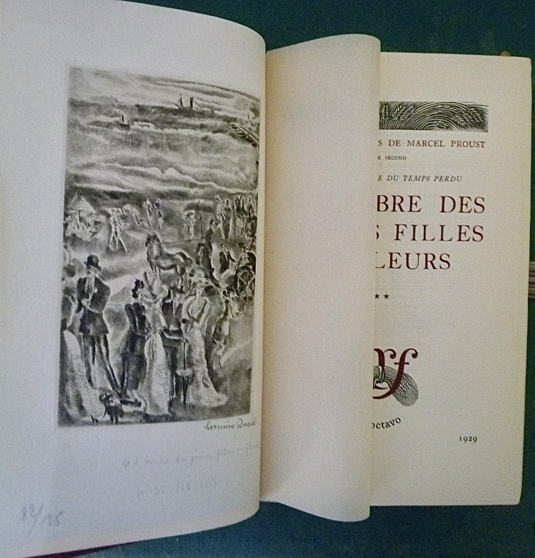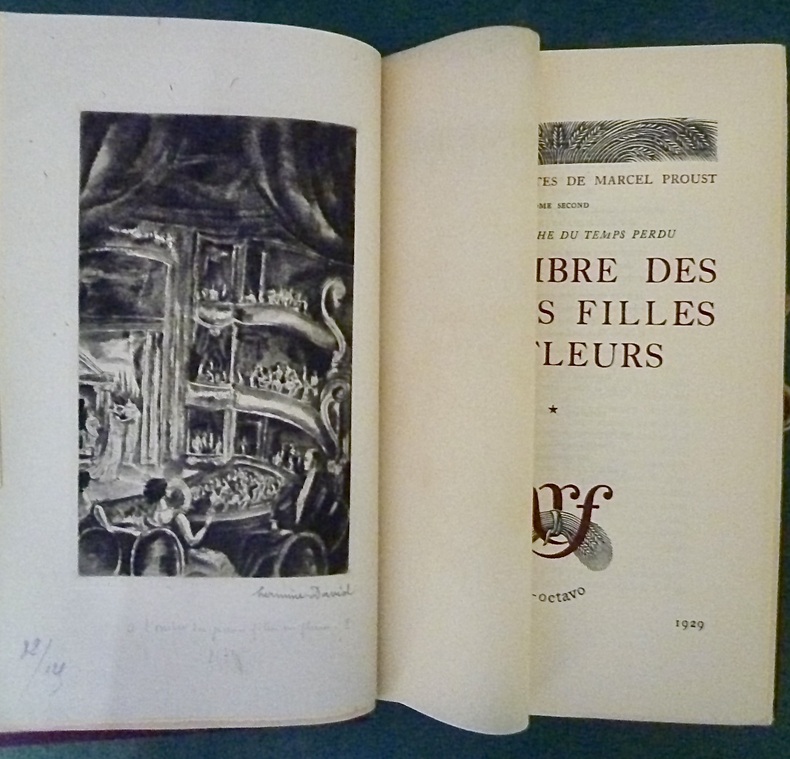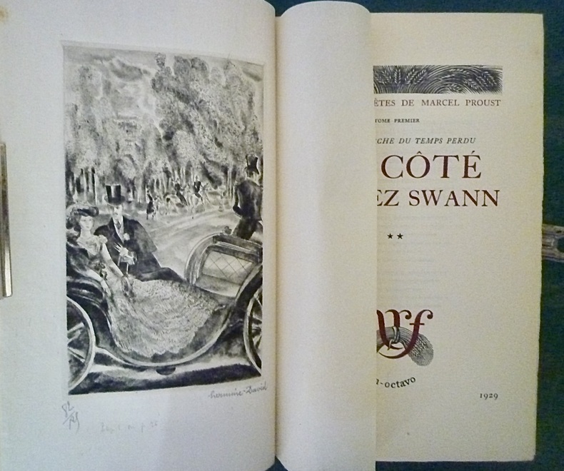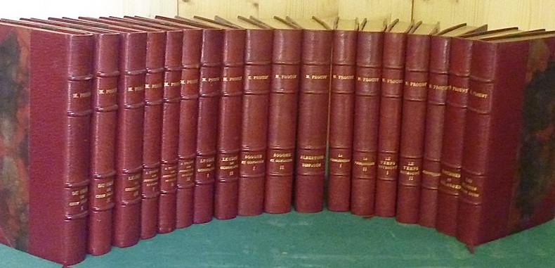Première édition collective. 1/125 exemplaires avec les 18 frontispices (pointes-sèches) gravés, numérotés et signés au crayon sur Chine par Hermine DAVID. Les frontispices n'ont été tirés qu'à 125 exemplaires sur Chine; joints indifféremment aux divers papiers. Quelques rares petites piqûres sur les marges des gravures, une petite tache en marge sur celui de Sodome et Gomorrhe (tome 1). Les serpentes, toutes présentes, ont bien protégé les pages de titre sans aucun report d'encre. Intérieur des ouvrages parfait. Hermine DAVID a indiqué sous chaque pointe-sèche de cet exemplaire, au crayon, le ou les numéros des pages dont elle a choisi l'illustration ainsi que le titre de l'ouvrage, ce qui a permis à l'imprimeur de bien situer les frontispices au tirage. On peut donc en déduire que ce jeu de pointes-sèches était celui d'Hermine David ce qui rend ce très bel exemplaire unique.