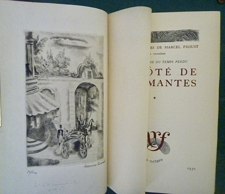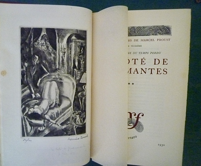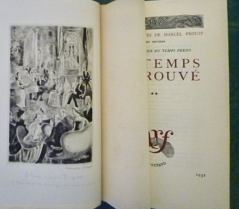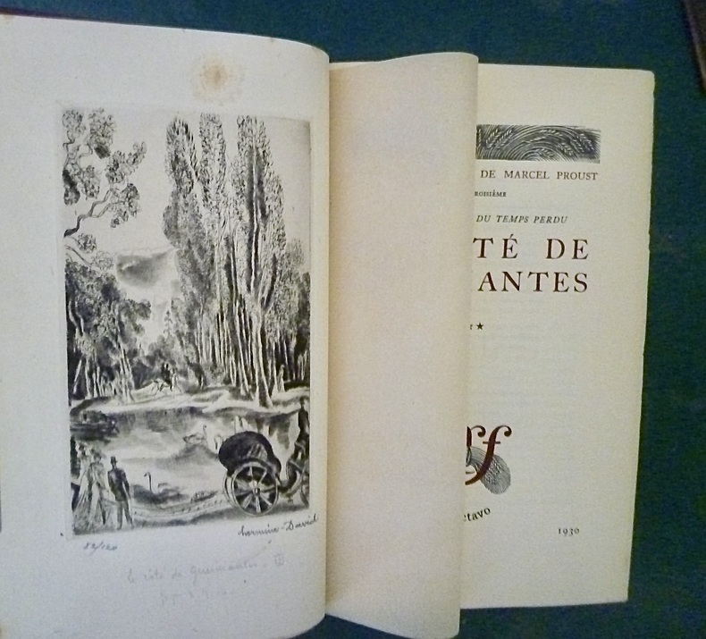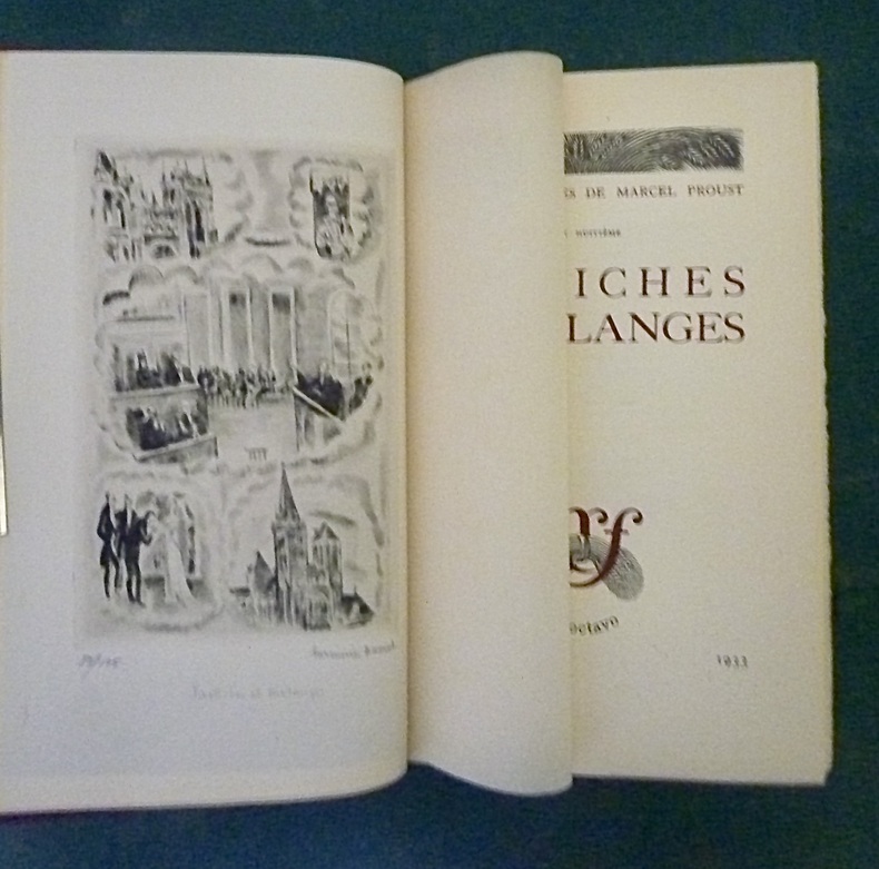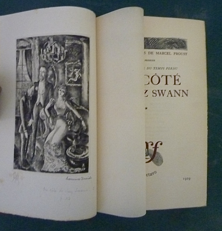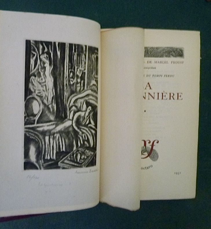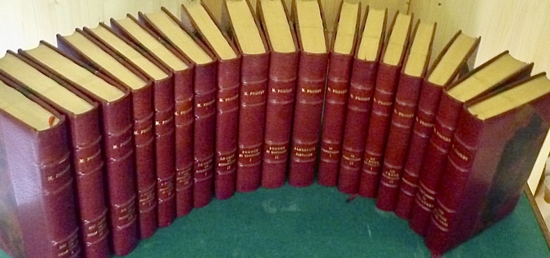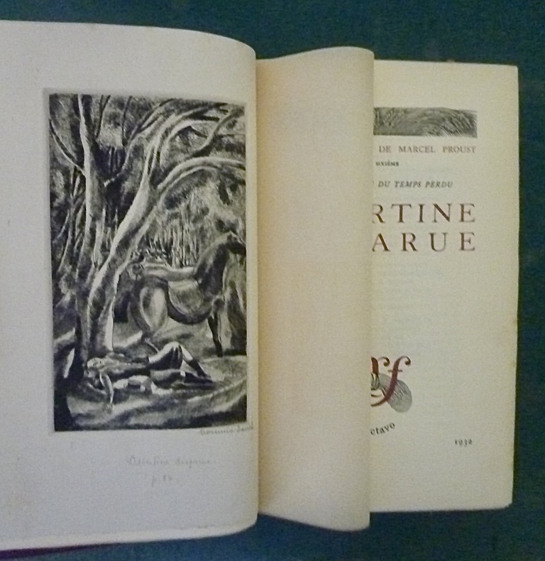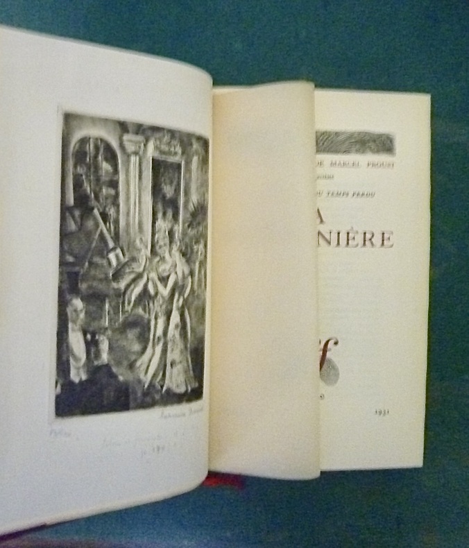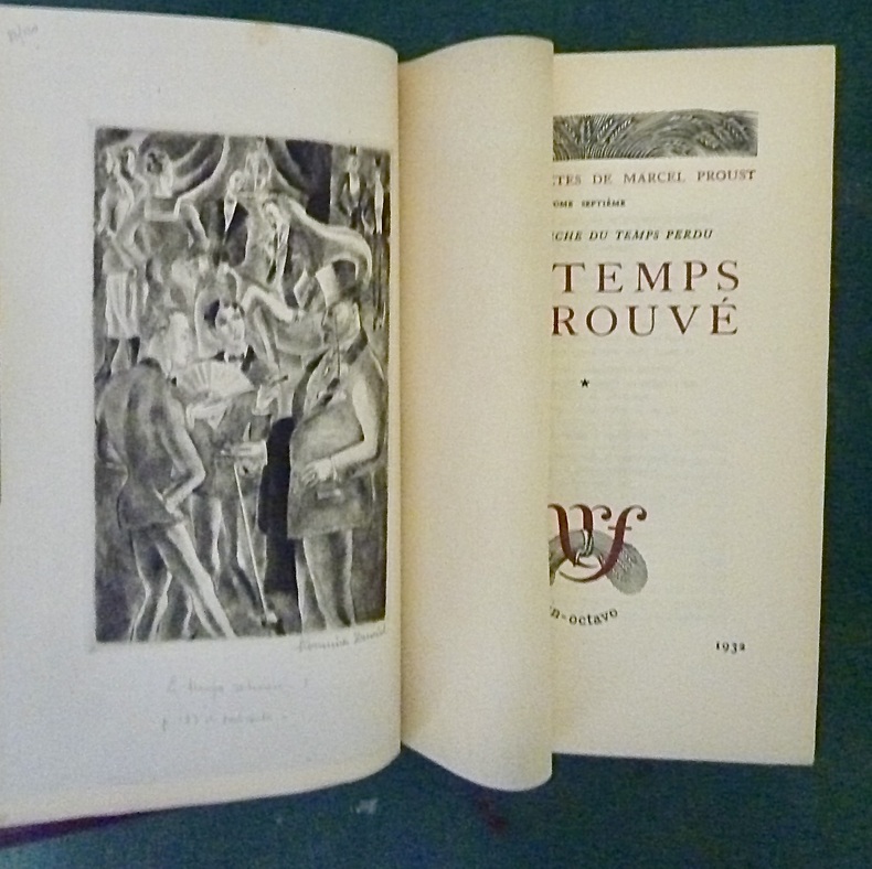 Première édition collective. 1/125 exemplaires avec les 18 frontispices (pointes-sèches) gravés, numérotés et signés au crayon sur Chine par Hermine DAVID. Les frontispices n'ont été tirés qu'à 125 exemplaires sur Chine; joints indifféremment aux divers papiers. Quelques rares petites piqûres sur les marges des gravures, une petite tache en marge sur celui de Sodome et Gomorrhe (tome 1). Les serpentes, toutes présentes, ont bien protégé les pages de titre sans aucun report d'encre. Intérieur des ouvrages parfait. Hermine DAVID a indiqué sous chaque pointe-sèche de cet exemplaire, au crayon, le ou les numéros des pages dont elle a choisi l'illustration ainsi que le titre de l'ouvrage, ce qui a permis à l'imprimeur de bien situer les frontispices au tirage. On peut donc en déduire que ce jeu de pointes-sèches était celui d'Hermine David ce qui rend ce très bel exemplaire unique.