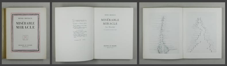 Monaco Editions du Rocher 1956 In-4, broché, couverture imprimée.Edition originale, illustrée de 48 gravures hors texte de l'auteur, contenant les observations psychologiques jusqu'à l'état démentiel, faites par Henri Michaux lors de quatre expériences successives avec un stupéfiant extrait du peyotl, la mescaline. Un des 1.650 exemplaires numérotés sur roto blanc. Neuf, non coupé.