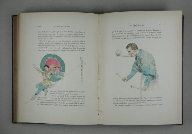 Abondantes illustrations in texte et parfois à pleine page de Jules Garnier, toutes mises en couleurs à l'aquarelle. Edition originale de cette superbe publication! Un des plus beaux livres sur le cirque et les saltimbanques. Carteret, V, 122; Vicaire, 225.