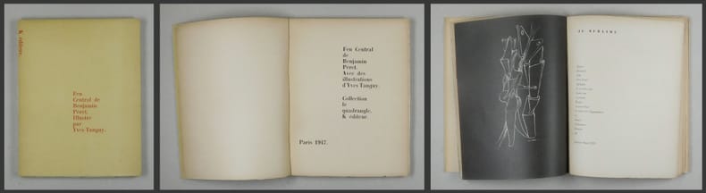 Collection le Quadrangle. K éditeur., Paris, 1947. 1 volume in-8 (247 x 195 mm) broché. 100 pp. + fnch sous couverture jaune façon parchemin imprimée du titre en rouge et chemise de papier gris, décorée au pochoir, avec découpe laissant apparaitre le titre sur le premier plat (Pierre Faucheux d'après un dessin d'Yves Tanguy), rhodoïd. ÉDITION ORIGINALE illustrée de 4 gouaches reproduites en phototypie en hors-texte. 1/30 ex. de tête sur vélin pur fil de Johannot, les seuls accompagnés d' UNE EAU-FORTE ORIGINALE D'YVES TANGUY, celle-ci justifiée XXV. La gravure est tirée en noir sur un feuillet volant (papier : 238 x 188 mm, cuivre : 175 x 135 mm). De même, l'exemplaire est numéroté XXV au colophon et paraphé à l'encre par l'éditeur. "Feu Central" regroupe les textes surréalistes "Immortelle Maladie" (1924), "Dormir, Dormir dans les Pierres" (1927), "Je Sublime" (1935), "Un Point C'est Tout" (1946) et "À Tatons", ce dernier publié ici pour la première fois. ENGLISH DESCRIPTION : Collection le Quadrangle. K éditeur., Paris, 1947. 4to. (247 x 195 mm). 100 pp. + fnch. First edition and first printing illustrated with 4 hors-texte phototypie plates reproducing gouaches by Tanguy, inserted loose (as issued) is Tanguy's original etching (leaf : 238 x 188 mm, plate : 175 x 135 mm). Original publisher's printed wrappers as issued : a grey jacket with illustration after Tanguy in white with excised section to front cover and beneath a yellow patterned wrapper with printed text in red. A mint copy of the 30 from the édition de tête on pur fil Johannot numbered XXV in Roman numerals and with Tanguy's original etching also numbered XXV by ink. Only these one have the etching. The original wrappers for the book were designed especially for the first 230 'exemplaires de luxe' of the book, were executed after the maquette by Pierre Faucheux after Tanguy's original drawing.