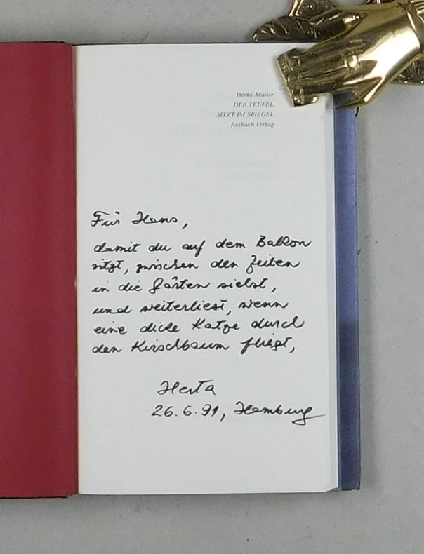 Erste Ausgabe. - Mit langer handschriftlicher freundschaftlicher Widmung mit einem poetischen Text, für Hans (Burger) signiert "Herta". - Im Schnitt leicht fleckig.
