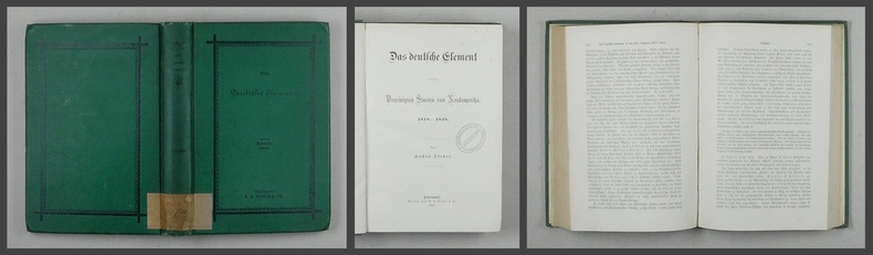 Originalausgabe. - Wahrscheinlich der erste Versuch einer Gesamtdarstellung der sprachlichen, kulturellen und politischen Einflussnahme der deutschen Einwanderer in die USA. Gustav Körner (1809 - 1896) musste aus politischen Gründen 1833 Deutschland verlassen. Als Anwalt und Publizist, und einer der wenigen Deutschen der das Englische beherrschte, kam er schnell in Kontakt zur politischen Elite. Er wurde einer der einflussreichsten Freunde von Abraham Lincoln (und war einer der 12 Sargträger bei dessen Begräbnis). Überzeugter Gegner der Sklaverei sah er den Bürgerkrieg voraus. Neben Carl Schurz einer der einflussreichsten Deutschen in Nordamerika. Das Buch vermittelt einen ausführlichen Einblick in die, bis gegen Ende des 19. Jahrhunderts, Machstellung der deutschen Sprache und Kultur. - Vorsatz und Titel gestempelt. Einbandecken schwach bestossen.