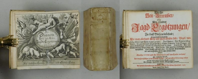 VD17 3:004037X. - Lindner 621.01. - Deutsche Bearbeitung der 1660 und 1695 erschienenen französischen Ausgabe von "Les ruses innoncentes", die sich hauptsächlich der Vogeljagd widmet, jedoch auch mit einem vollständigen Kapitel über das Fischen und ein weiteres Kapitel zur Jagd von Kleintieren. Dem deutschen Text lag die Amsterdamer Ausgabe von 1695 zugrunde, deren Bildtafeln spiegelverkehrt reproduziert wurden. Nach Lindner existieren zwei identische deutsche Ausgaben, wovon eine nicht datiert ist. - Mit dem allegorischen gestochenen Titelblatt und 66 teils gefalteten gestochenen Tafeln. - Blatt 35/36 des 2. Teils mit Papierdurchbruch und kleinem Textverlust. Tafel 5 des 3. Teils mit Fehlstelle am äusseren Rand. Titelblatt im Falz mit Japanpapier verstärkt. Einige Tafeln mit restaurierten Falt- bzw. Knickspuren. Ca. 150 Seiten Schnitt und am oberen Rand mit Tintenfleck ausserhalb des Textes. Ohne den hinteren fliegenden Vorsatz. Mit mehreren handschriftlichen Besitzvermerken aus dem 18. bis 20. Jahrhundert auf dem Vorsatz, darunter Emanuel Gaudard, Berner Buchbinder und Förster (1689-1770). - Gutes Exemplar in zeitgenössischem Einband. Komplet und gut erhalten sehr selten.