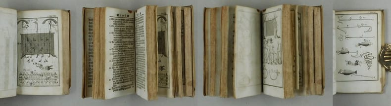 Augsburg, Auf Unkosten Lorentz Kroniger und Gottlie Göbels See.Erben / Buchhändl. 1696. 8°. Doppelblattgrosses gestochenes Frontispiz, doppelblattgrosses Titelblatt, [8] Bl. Vorrede, 119 S., 7 Bl. Tafeln, 128 S., 17 Bl.Tafeln, 141 S., 16 Bl.Tafeln, 90 S., 10 Bl.Tafeln, 119 S., 16 Bl. Tafeln. Pergamentband der Zeit mit handschriftlichem Rückentitel.