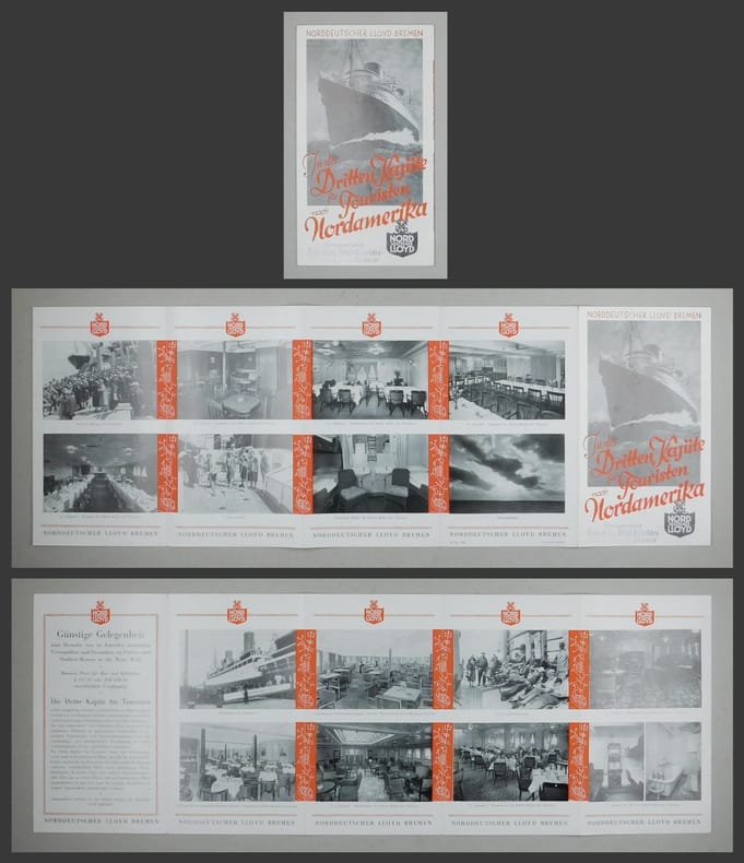 "Die Dritte Kajüte für Touristen bietet den Passagieren, wenn auch in bescheidenem Masse, fast alle die Annehnlichkeiten, denen sich die Reisenden der höheren Schiffs-Klassen erfreuen, einschliesslich Bäder sowie geräumiger Decks, Bordspiele, Konzerte, Tanz und anderer Veranstaltungen." Mit dem Vermerk "Auswanderer werden in der Dritten Kajüte für Touristen nicht befördert". - Deckel mit dem Stempel "Aktiengesellschaft Meiss & Co. Lloyd Reisebüro, Bahnhofstrasse 40, Zürich".