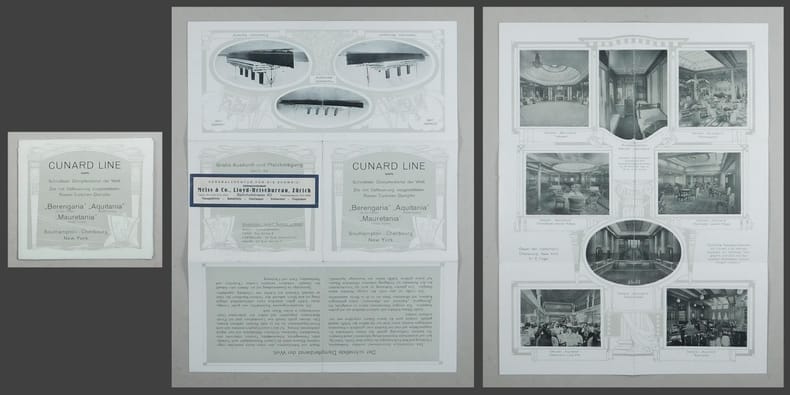 Liverpool, Cunard Line. (Ca. 1920er Jahre). 36,8x28 cm (gefaltet 12,6x14 cm). 12 Seiten Faltprospekt mit 11 s/w. Abbildungen.