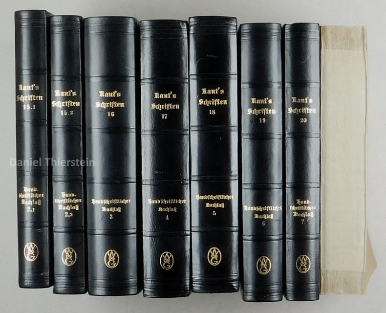 "Kant's gesammelte Schriften Band XV-XX und XXII." - Fotomechanischer Nachdruck 1971. - Ungelesen. Der Broschurband am Rücken geklebt.