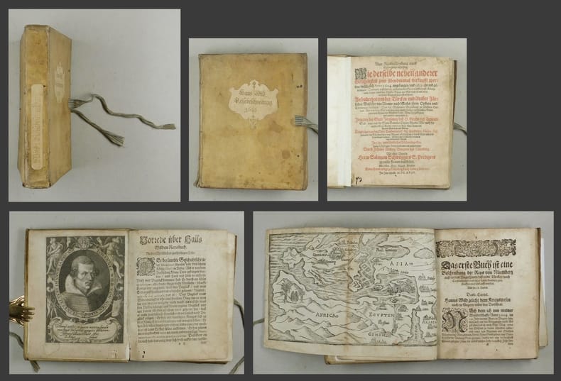 Nürnberg, Gedruckt und verlegt durch Ludwig Lochnern. 1623. Klein-4°. Mit gestochenem Porträtfrontispiz von D. Krüger, einer gefalteten Holzschnittkarte, 20 n.n. Bl., 262 S. 1 w. Bl. Pergamentband der Zeit mit späterem handschriftlichem Rücken- und Deckeltitel und Schliessbändern.