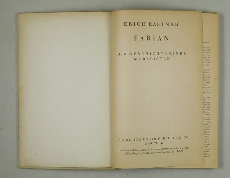 Seltene, auf schlechtem Zeitungspapier gedruckte Neuausgabe i des 1931 bei der Deutschen Verlagsanstalt in Stuttgart erschienenen Romans. Mit dem gedruckten Vermerk "Published and distributed in the public interest by authoity of the Alien Property Custodian under License No. A-935" - Papier durchgehend stärker gebräunt. Buchblock gelockert. Einband angestaubt. Selten.