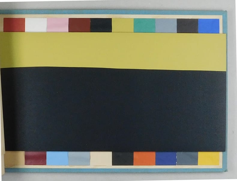 Basel, Salubra. 1959. 25 x 40 cm. Mit 9 Textblättern, 14 doppelblattgrossen Tafeln mit Tapetenmuster, 19 (von 20) einfarbigen Tapetenmuster, einer Farbenklaviatur mit 20 Farbenmuster im hinteren Innendecel sowie 2 Schablonen in transparenter Folie. Originalhalbleinwandband mit Deckelillustration und Schraubenbindung mit 3 Schrauben.