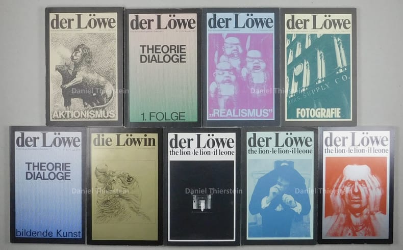 Fast vollständige Reihe der anspruchsvollen kunsttheoretischen Zeitschrift, es fehlt wie meist die Nummer 0, die in Kleinstauflage erschien. - Nr. 1: Aktionismus. - Nr. 2: Die Postmoderne. - Nr. 3: Realismus. - Nr. 4: Fotografie. - Nr. 5: Theorie Dialoge. - Nr. 6: Die Löwin. - Nr. 7: James Lee Byars. - Nr. 8: Maurizio Nannucci. - Nr. 9: Jürgen Klauke. - Ein wichtiger Beitrag zur Berner Avant-Garde. - Einbände an den Kanten stellenweise schwach berieben. Einige feine Bleistiftanstreichungen, sonst sehr gut erhalten.