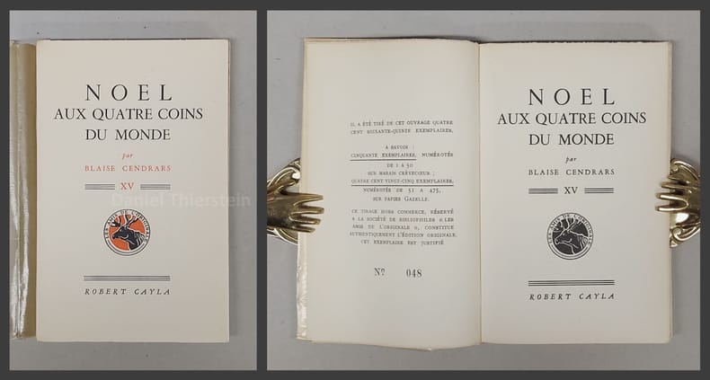 Édition originale de ces anecdotes de Noël en Nouvelle-Zélande, en Chine, à Rotterdam, à Rio mais aussi avec Max Jacob, chez les Indiens du Nouveau Mexique, au « Boeuf sur le Toit » ou dans la forêt des Ardennes. Ornements typographiques gravés sur bois par Paul Baudier. Tirage à 475 exemplaires hors commerce, réservés à la société « Les Amis de l'originale », celui-ci un des 425 sur papier gazelle. Exemplaire bien relié par Devauchelle. Dos passé.