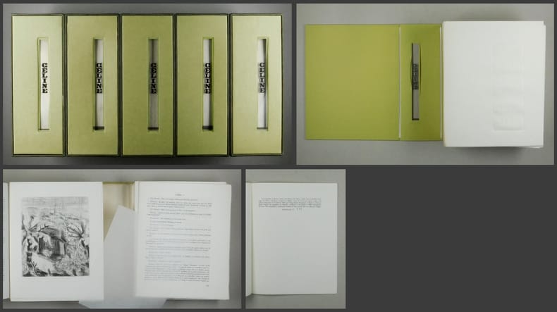 Premiere édition collectife tirée à 4180 exemplaires. Un des 180 premiers sur vélin pur fil avec les 80 illustrations réalisé seul pour le tirage de tête comme eaux-fortes. - Contient: Tome I: Voyage au bout de la nuit. Théâtre. Thèse. Tome II: Mort à crédit. Casse-pipe. Gignol's band I. Tome III: Gignol's band II. Le pont de Londres. Féerie pour une autre fois I. Tome IV: Féerie pour une autre fois II. Normance. D'un château l'autre. Tome V: Nord. Rigodon. - Parfait état.