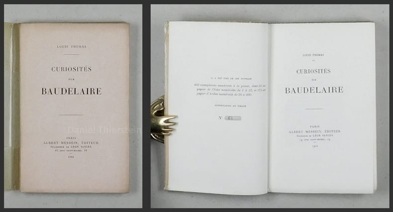 Paris, Albert Messein Éditeur, 1912, édition originale tirée à 400 exemplaires numérotés, 1/375 sur papier d’Arches (n°284). Broché, couverture rempliée, 12 cm x 19 cm, 66 pages. Texte de Louis Thomas, bien complet du prière d’insérer. Bon état