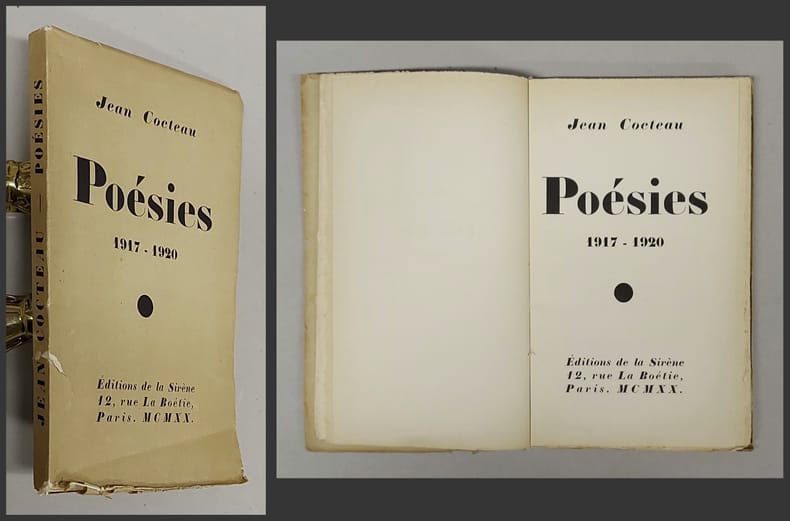 Edition originale sur papier courant. Reliure à la bradel en plein papier à effets géométriques dorés et moirés, dos lisse, pièce de titre de maroquin noir, tête dorée, fragiles couvertures et dos (renforcé) conservés, reliure signée P. Goy & C. Vilaine. Envoi autographe signé de Jean Cocteau : "A mon cher ami Marcel Herrand. Jean Cocteau. 1920." Dans le premier article de Carte blanche (1919), Jean Cocteau fait l'éloge du jeune comédien Marcel Herrand, alors âgé de vingt-deux ans: «L'esprit nouveau agite toutes les branches de l'art. De jeunes acteurs se mettent au service de la poésie moderne. Marcel Herrand (qui créaLes Mamelles de Tirésiaset différents rôles masqués duDit des jeux du monde) fut le premier à nous surprendre par son rythme, sa voix droite et son mépris de l'effet. Gestes, intentions, bêlements, cris, sourires, nuances sous chaque syllabe, jeux du timbre, disparaissent ici pour faire place à une lecture typographique. Un noir d'encre. Les mots nets se détachent de la page l'un après l'autre. L'acteur ne substitue pas son émotion à celle du poète. Il le sert au lieu de s'en servir.» Durant les années 1920, Cocteau confiera plusieurs rôles au talentueux Marcel Herrand: d'abord phonographe dans Les Mariés de la tour Eiffel (1921), il obtiendra le premier rôle masculin dans Roméo et Juliette (1924) et incarnera même l'ange Heurtebise dans la première distribution d'Orphée en 1926. Emouvant et précoce hommage de Jean Cocteau à l'un de ses acteurs fétiches. - Photographies et détails sur www.Edition-Originale.com -