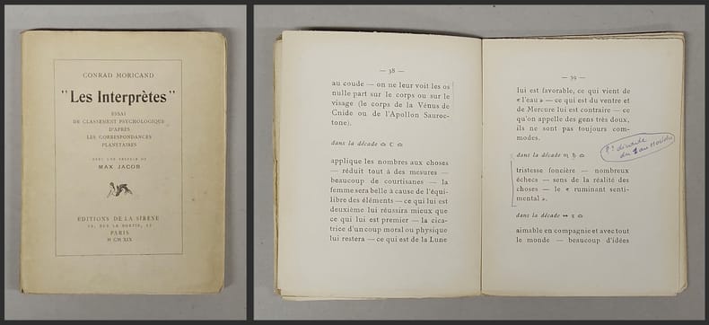 "La préface par Max Jacob est comme le livre en édition originale. Exemplaire sur beau papier bouffant, comme il se doit marqué du monogramme C.M.; n°149. Converti au catholicisme en 1915 par une série de visions, Max Jacob essaie dans sa préface d'opérer un difficile syncrétisme entre la croyance au libre arbitre, constitutive de sa foi, la part de déterminisme que suppose l'astrologie et, si nous avons bien suivi, le progrès des études sur les rayonnements que poursuit alors Marie Curie dans le cadre de l'Institut du Radium. Quand à l'astrologue charismatique Conrad Moricand -également connu comme dessinateur, illustrateur de Salmon et de Cendrars-, il continuera pour le meilleur et pour le pire d'inspirer les écrivains, ainsi qu'en témoigne son portrait au vitriol dans Un diable au paradis (1956) de Henry Miller qui l'avait hébergé à Big Sûr. Miller sera sommé de remplacer le nom de Moricand, de fait le personnage principal du récit avec le narrateur et son épouse, par le transparent pseudonyme de Téricand. Il a récemment été avancé que Max Jacob aurait en réalité tenu la plume sur la totalité de l'ouvrage, ce qui aurait aidé Conrad Moricand à se faire la place qu'il allait continuer d'occuper au catalogue d'éditeurs plus habitués à publier de la littérature moderne. Exemplaire à l'état de neuf."