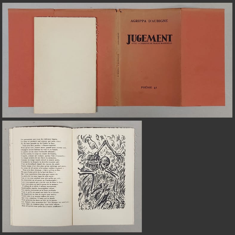 Edition illustrée de 10 compositions en noir de Masereel, tirage à 471 exemplaires numérotés, celui-ci est un des 60 exemplaires sur Lafuma. Le colophon est éloquent : ""Ce livre est achevé d'imprimer le 25 décembre 1941 sur un monde qui paraît voué à la fureur de Dieu, c'est NOEL, Noël hurlant de massacres et d'incendies. Cependant, il faut croire. Dans la nuit, au dessus des malheurs et des siècles, ""Poésie 41"" reprend le message d'un grand poète. Certaines oeuvres brûlent comme des torches. Il faut assurer les relais""... Bon etat
