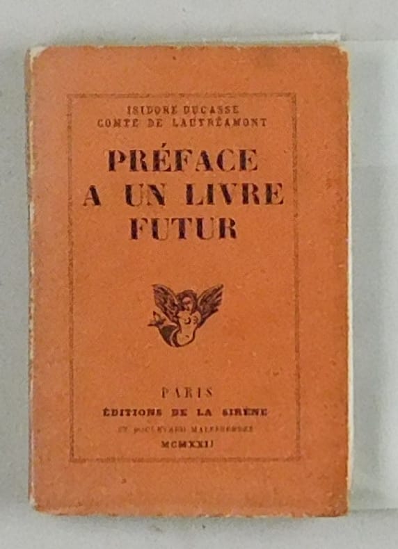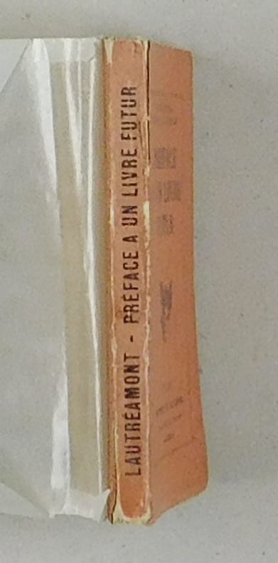 Fouché 126. - Première édition sur papier courant après 30 ex. sur vélin pur fil Lafuma. Avec une postface de l'éditeur "Après avoir publié les Chants de Maldoror (1868) Isidore Ducasse - en littérature, comte de Lautréamont - projetait un livre qui eût contrasté systématiquement avec le caractère pessimiste de sa première oeuvre et dont la préface, révélatrice à cet égard, était écrite dès le printemps de 1870. C'est bizarre réface que nous rééditions aujourd'hui. Quant au livre auquel elle s'applique, on n'en connait aucun fragment. Du reste, Lautrémont mourait, cette même année 1870 à Paris". - Petite manque au dos de la couverture.