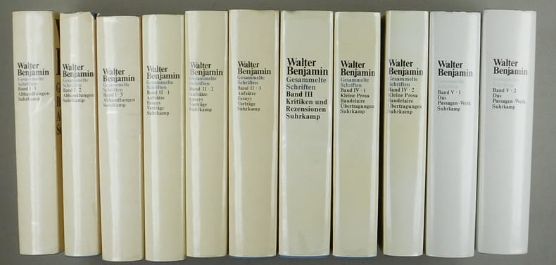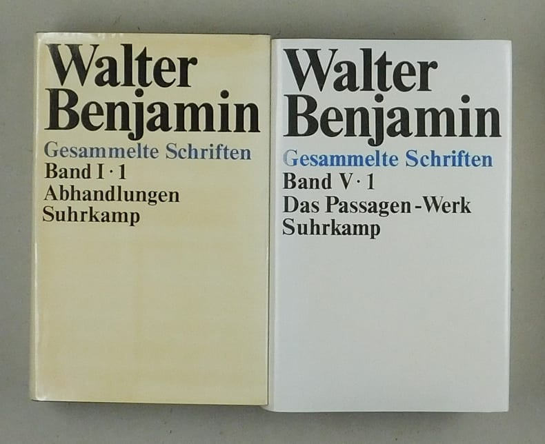 Ohne die 3 Supplementbände. - Band I.1-3: Abhandlungen. 1974. - Band II.1-3: Aufsäte, Essays, Vorträge. 1977. 1. Auflage. - Band III. Kritiken und Rezensionen. 1972. - Band IV.1-2: Kleine Prosa. Baudelaire-Übertragungen. 1972.. - Band V.1-2: Das Passagen-Werk. 1982. 2. Auflage. - Ohne die Bände 6 und 7. Schutzumschläge stellenweise gebräunt und mit kleinen Läsuren. Ungelesenes Exemplar.