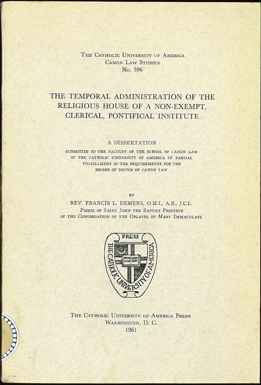 , Washington, The cath. Univ. of America Press 1961, in-8, br., bon état, (marques de bibliothèque), XI-143p.