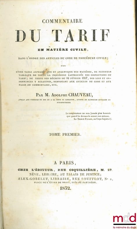 A PARIS - IMPRIMERIE D'HIPPOLYTE TILLIARD. 1832. In-8. Relié demi-cuir. Etat d'usage, Coins frottés, Dos frotté, Intérieur frais. XI + 556 + 621 PAGES - Augmenté d'une planche depliante de TARIFs en fin du 2e volume - Plats et contre-plats jaspés - Titre, tomaison, filets et roulettes dorés aux dos - Dos e ncuir marron. + 1 note manuscrite sous forme de tableau (en supplement).. . . . Classification Dewey : 346-Droit privé, civil
