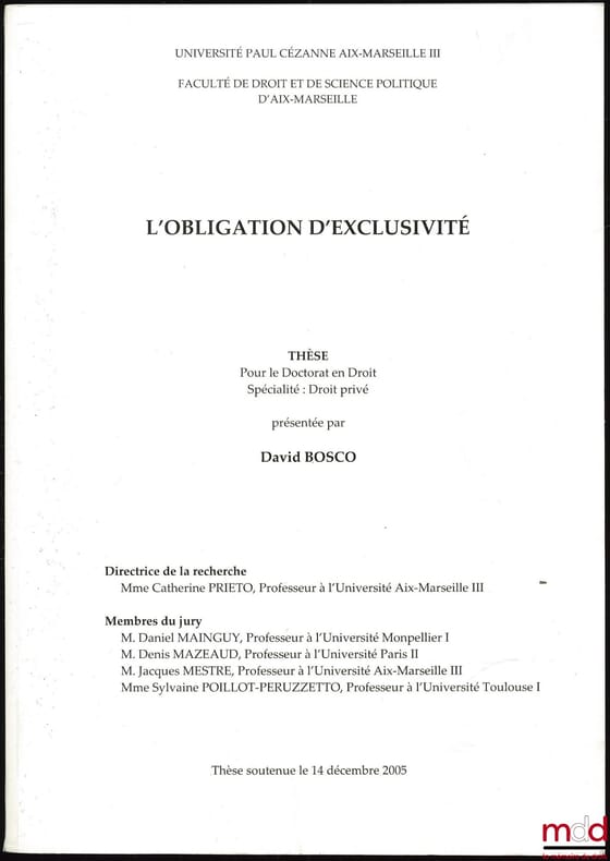 , Aix-Marseille 2005, A4, thèse dactylographiée et thermo-reliée, [Cet ouvrage provient de la bibliothèque des Avoués près la cour d’appel de Paris, il peut être frappé aux armes de la Chambre des Avoués et revêtir des marques de bibliothèque], 504p.-[41ff.].