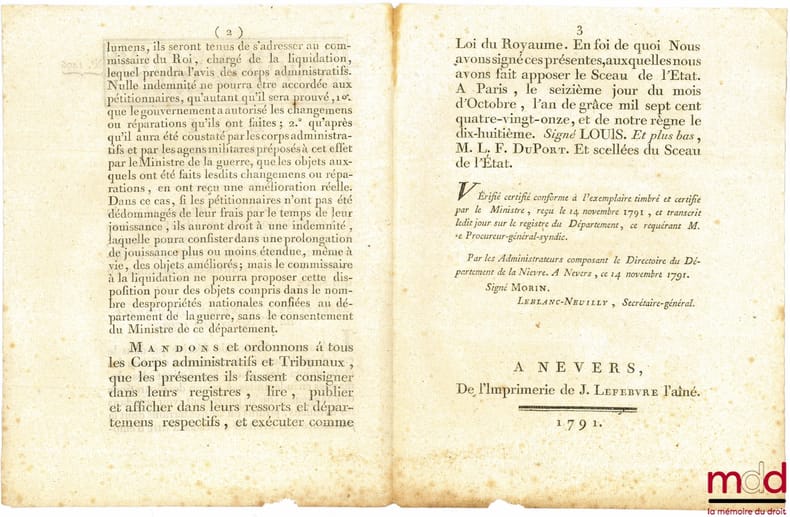 , Nevers, Imprimerie de J. Lefebvre 1791, in-4, feuillets libres coupés, (deux accrocs en bas de page, qq. rousseurs), 3p.