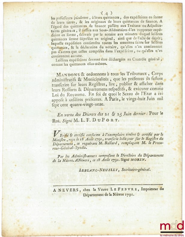 , Nevers, Imprimerie de la Veuve Lefebvre 1791, in-4, feuillet libre coupé, (qq. rousseurs), 4p.