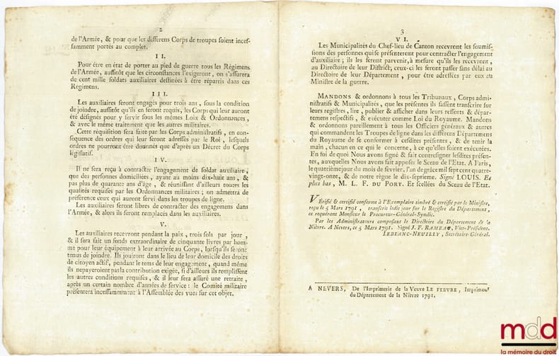 , Nevers, Imprimerie de la Veuve Lefebvre 1791, in-4, feuillet libre coupé, (papier insolé aux coins), 3p.