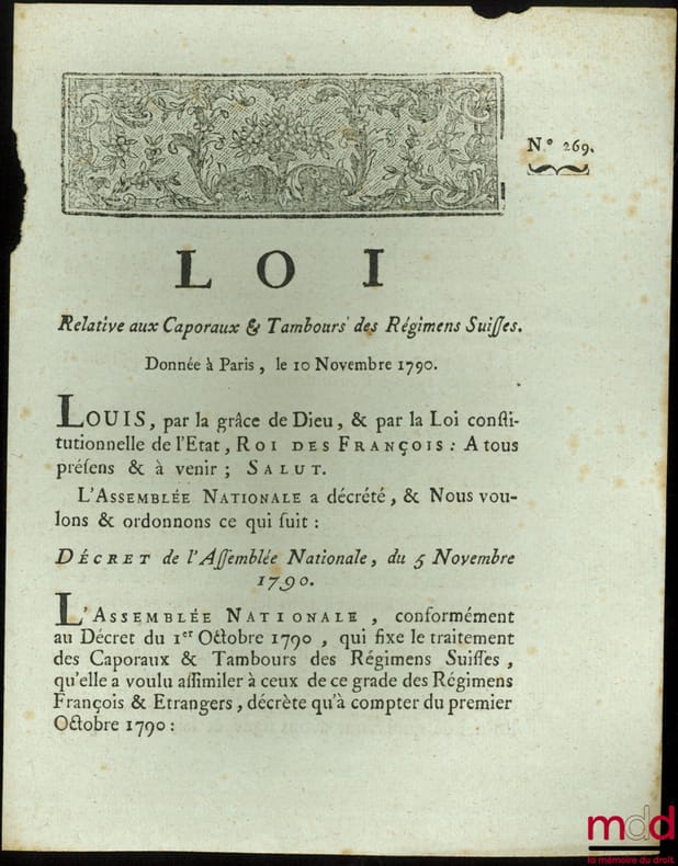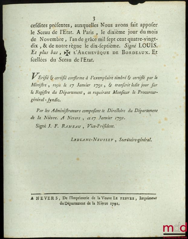 , Nevers, Imprimerie de la Veuve Lefebvre 1790, in-4, feuillets libres rognés, (qq. accrocs aux coupes, qq. rousseurs), 3p.