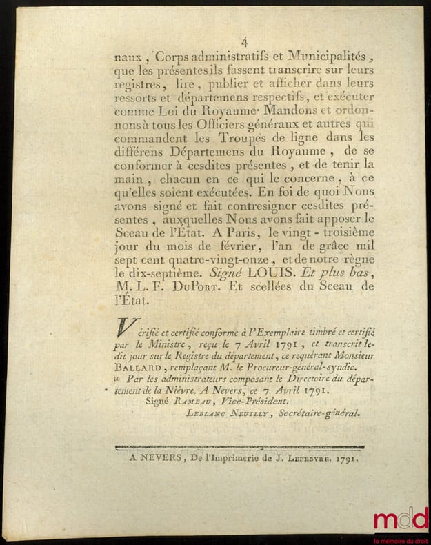 , Nevers, Imprimerie de J. Lefebvre 1791, in-4, feuillets libres rognés, (rares rousseurs), 4p.
