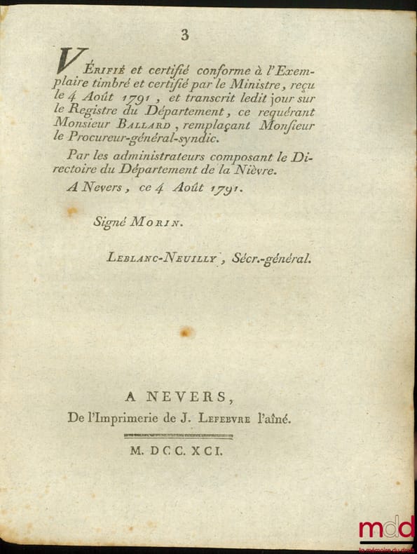 , Nevers, Imprimerie de J. Lefebvre 1791, in-4, feuillets libres rognés, (papier insolé et qq. rousseurs), 3p.