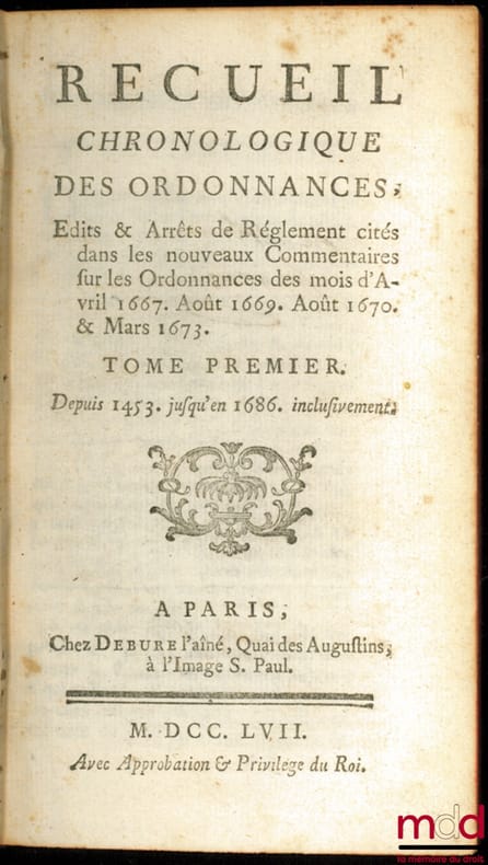 , Paris, Debure l’aîné 1757, in-8, plein veau fauve moucheté, tit. et tom. dorés sur pc. bordeaux et noires, dos à 5 nerfs ornés de fleurons et filets encadrant dorés, tr. rouges, (mors fendus, coiffes accidentées, coins émoussés avec des mq., dos et nerfs frottés avec de petites épidermures, qq. rousseurs marginales), XXX-656p.