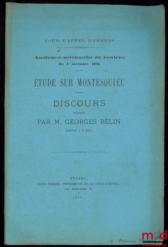 , Angers, Lainé Frères, imprimeurs de la Cour d’appel 1874, in-8, br., bon état, 41 p.