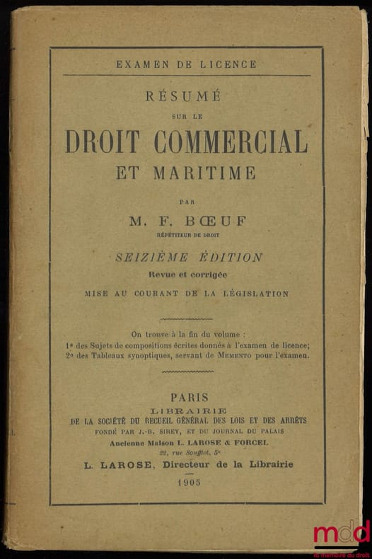 , Paris, Libraire L.Larose 1905, in-8, br., non massicoté, partiellement non coupé, (couv. fanée, rares rousseurs, ff. représentant les tableaux synoptiques désolidarisé), 546p.