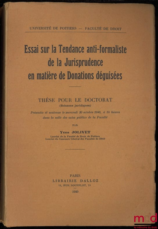 , Paris, Dalloz 1940, in-8, br., non massicoté, présence d’un feuillet avec une dizaine de notes manuscrites prises durant la lecture de l’ouvrage, (couv. fanée, feuilles jaunies, qq. soulignures au crayon en marge), intérieur frais, [Cet ouvrage provient de la bibliothèque personnelle du professeur Jean Carbonnier (1908-2003)], 316p.