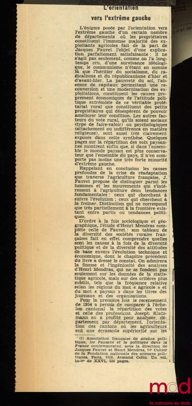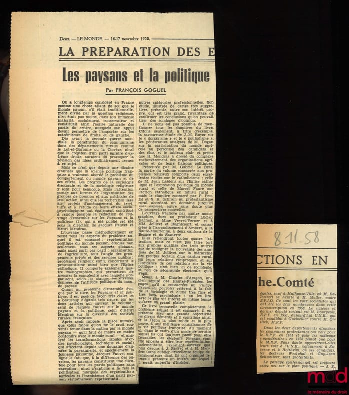 , Leiden, International Organization of Old Testament Scholars 1957, in-8, br., présence d’une coupure de l’article de FrançoisGoguel, «Les paysans et la politique», Le Monde, 16-17novembre 1958, (couv. fanée, qq. soulignures au crayon en marge), intérieur frais, [Cet ouvrage provient de la bibliothèque personnelle du professeur Jean Carbonnier (1908-2003)], [9]p.