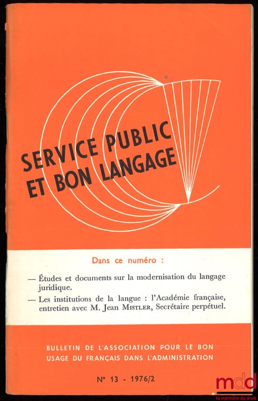 , Paris, Association pour le bon usage du français dans l’Administration 1976, in-8, br., (couv. lég. fanée, feuilles lég. jaunies), intérieur très frais, 78p.