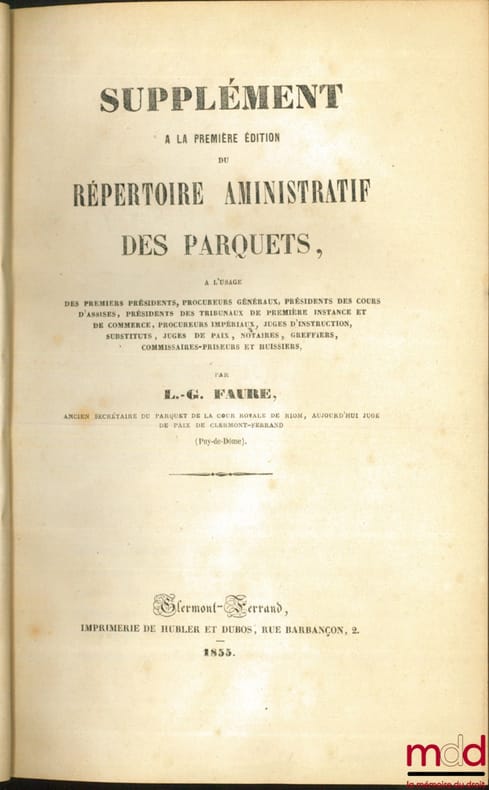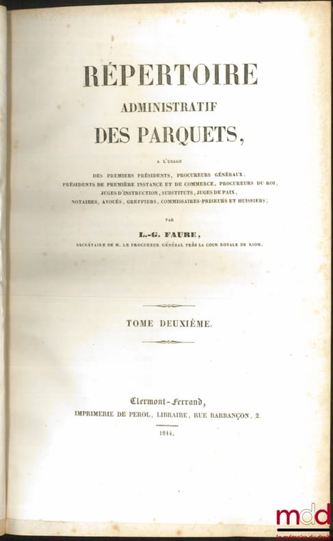 , Clermont-Ferrand, Impr. de Pérol/ Impr. de Hubler et Dubos 1843/ 1844/ 1855, 3 vol. in-8, demi-veau grenat, tit. & tom. dorés sur dos à 4nerfs avec roulettes et filets dorés, (rel. légt frottées avec qq. épidermures et mors usés, coins et coupes frottés avec qq. mq. de papier, des rousseurs), bon état malgré les défauts soulignés, XI-495/ 495/ VII-381p.