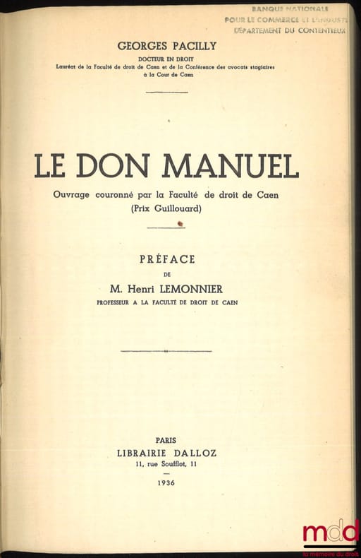 , Paris, Dalloz 1936, in-8, demi-vélin ivoire, tit. doré sur pc. de maroquin bordeaux avec filets dorés encadrants, dos orné de dentelle dorée, rel. au chiffre «J.G.G.», couv. cons., (rares rousseurs), bon état, VII-622p.