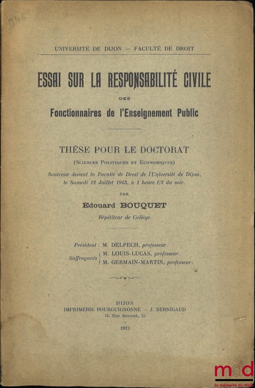 , Dijon, Imp.Bourguignonne- J.Bernigaud 1913, in-8, br., non coupé, (br. fragile avec léger mq. au dos, mouillure au bas de l’ouvrage sans incidence sur la lecture), int. très frais, 210p.