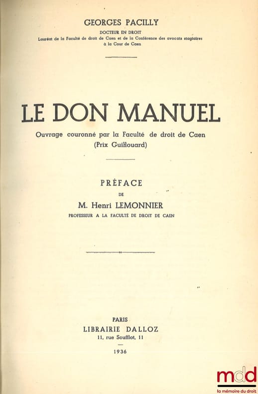 , Paris, Dalloz 1936, in-8, demi-vélin ivoire, tit. doré sur pc. de maroquin bordeaux avec filets dorés encadrants, dos orné de dentelle dorée, rel. au chiffre «J.G.G.», couv. cons., (rares rousseurs), bon état, VII-622p.
