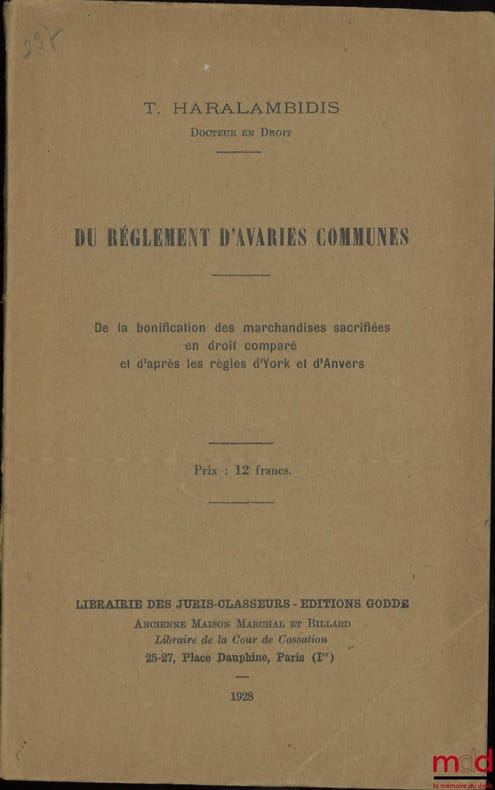 , Paris, Librairie des Juris Classeurs - Éditions Godde (Ancienne maison Marchal et Billard) 1928, in-8, br., assez bon état, 78p.