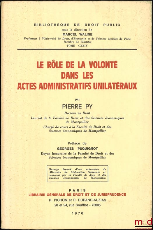 , Paris, L.G.D.J. 1976, in-8, br., ENVOI DE L’AUTEUR AU PROFESSEUR WALINE, bon état, [ce livre provient de la bibliothèque personnelle de Marcel et Jean Waline], [4ff.]-180p.