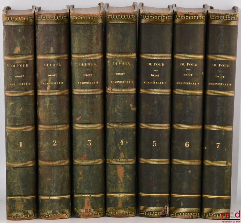 , Paris, Cotillon 1854 à 1857, 7 vol. in-8, demi-veau vert empire, tit. et tom. dorées sur dos lisse orné de triples filets dorés soulignants et de frises dorées, Ex-libris tamponné «J.Berriat StPrix», (rel. usée avec des épidermures not. sur les coiffes, coupes frottées avec mq. de papier, plats légt frottés, des rousseurs à l’int., t.V: coiffe inf. accidentée et impact sur le dos, tr. partielt hachurée à l’encre), [ce livre provient de la bibliothèque personnelle de Marcel et Jean Waline].