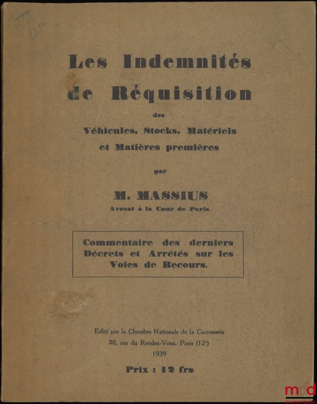, Paris, Chambre Nationale de la Carrosserie 1939, in-8, br., bon état, [44p.].