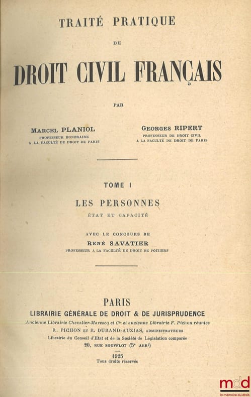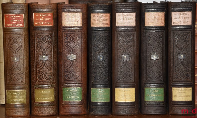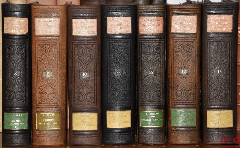 , Paris, L.G.D.J. 1925-1934, 13 vol. in-8, demi-chagrin ébène, tit. doré sur pc. de cuir grenat et olive encadrées par un filet doré, dos à faux nerfs orné d’arabesques et de filets estampés à froid, tr. mouchetées, (coupes parfois lég. frottées), excellent état, int. très frais, [~ 11378p.].