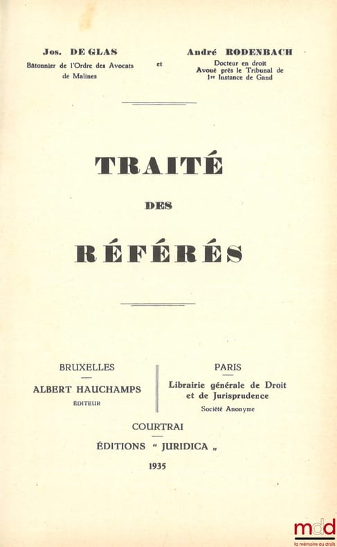 , Bruxelles- Paris - Courtrai, A. Hauchamps - L.G.D.J. - Juridica 1935, in-8, demi-basane vert empire, tit. doré sur dos à 4nerfs orné de filets estampés à froid, (rel. lég. usée avec qq. épidermures), bon état, int. frais, 255p.