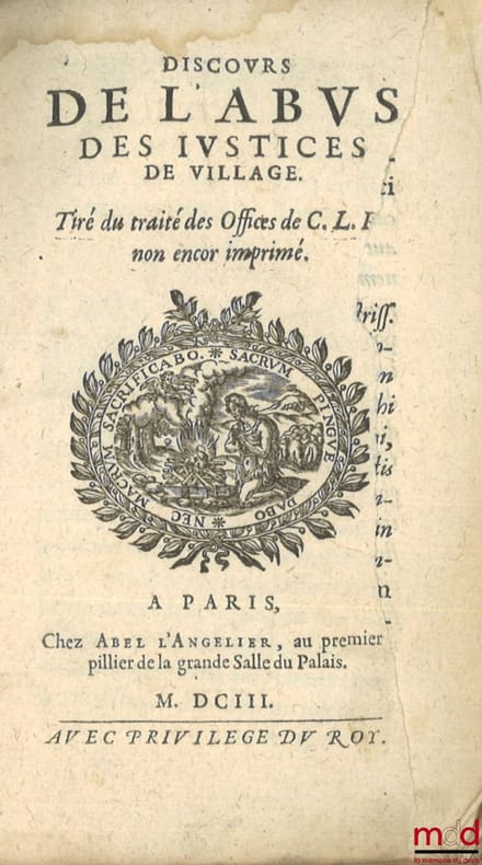 , Paris, Abel l’Angelier, au premier pillier de la grande Salle du palais 1603, in-16, pl. vélin, lettrines ornées et bandeaux, (ouvrage usé, partielt dérelié, dernier feuillet détaché avec mq. partiel de texte, page de tit. partielt déchirée, 2 autres p. partielt déchirées mais sans mq. de texte), 80p.